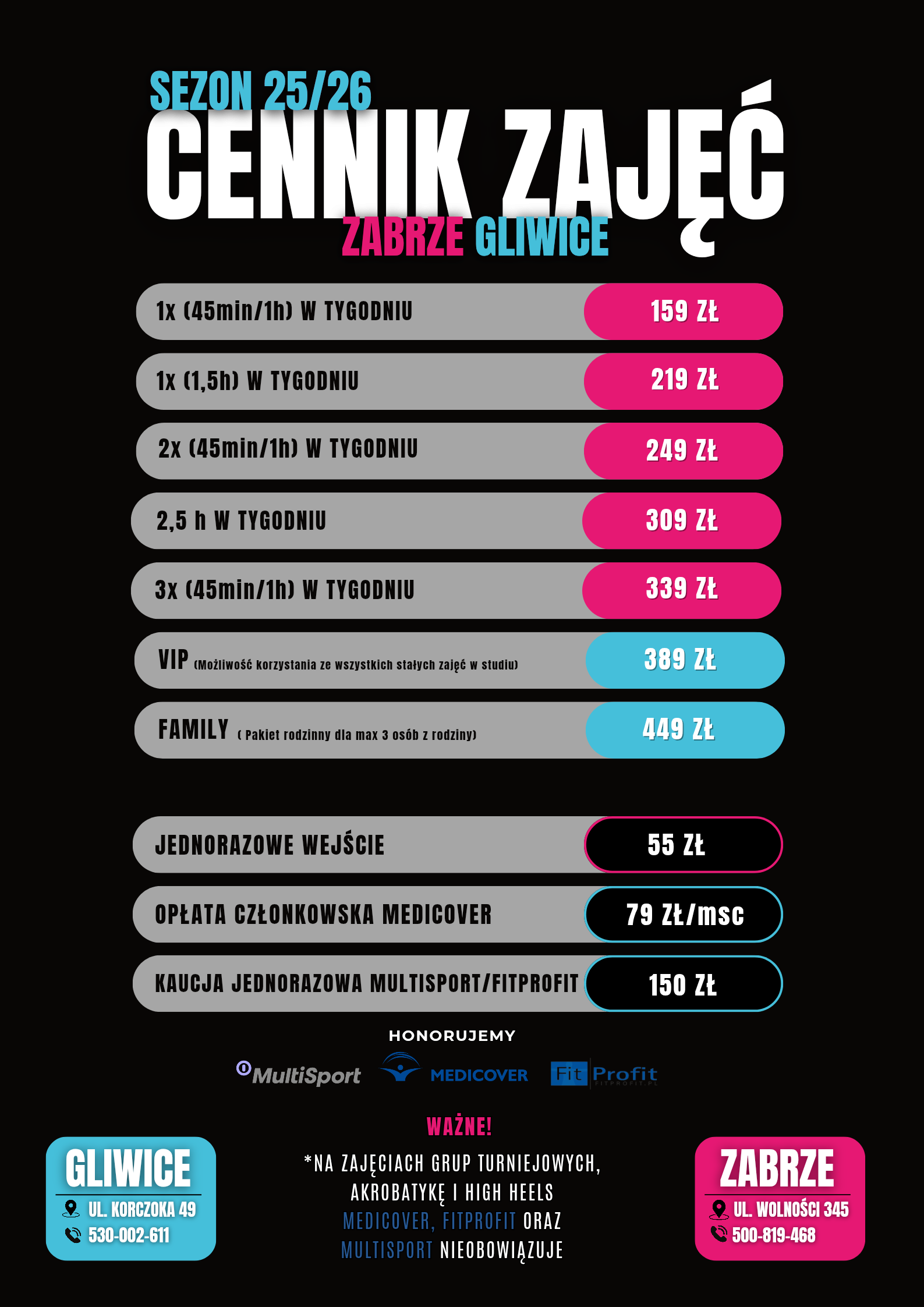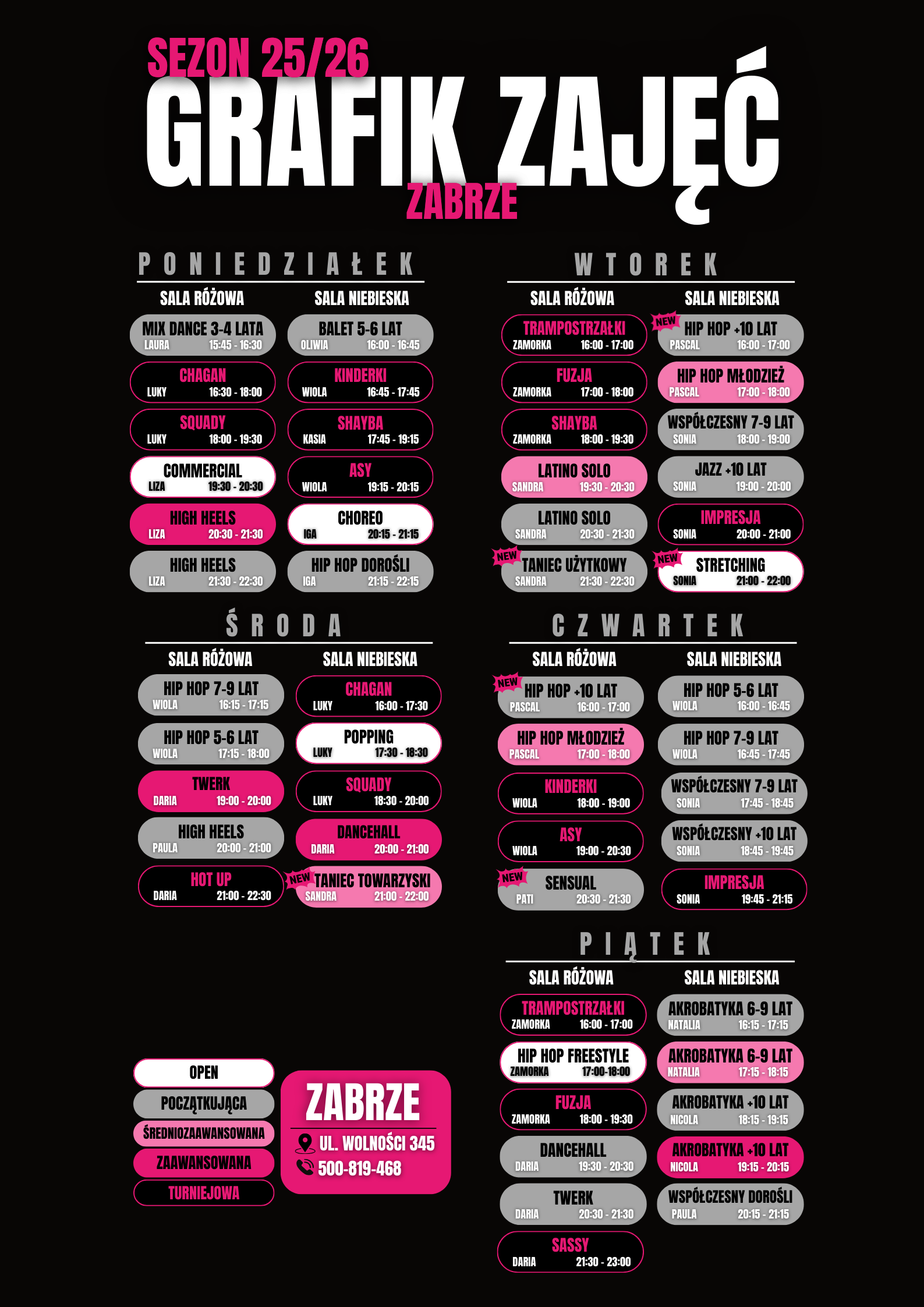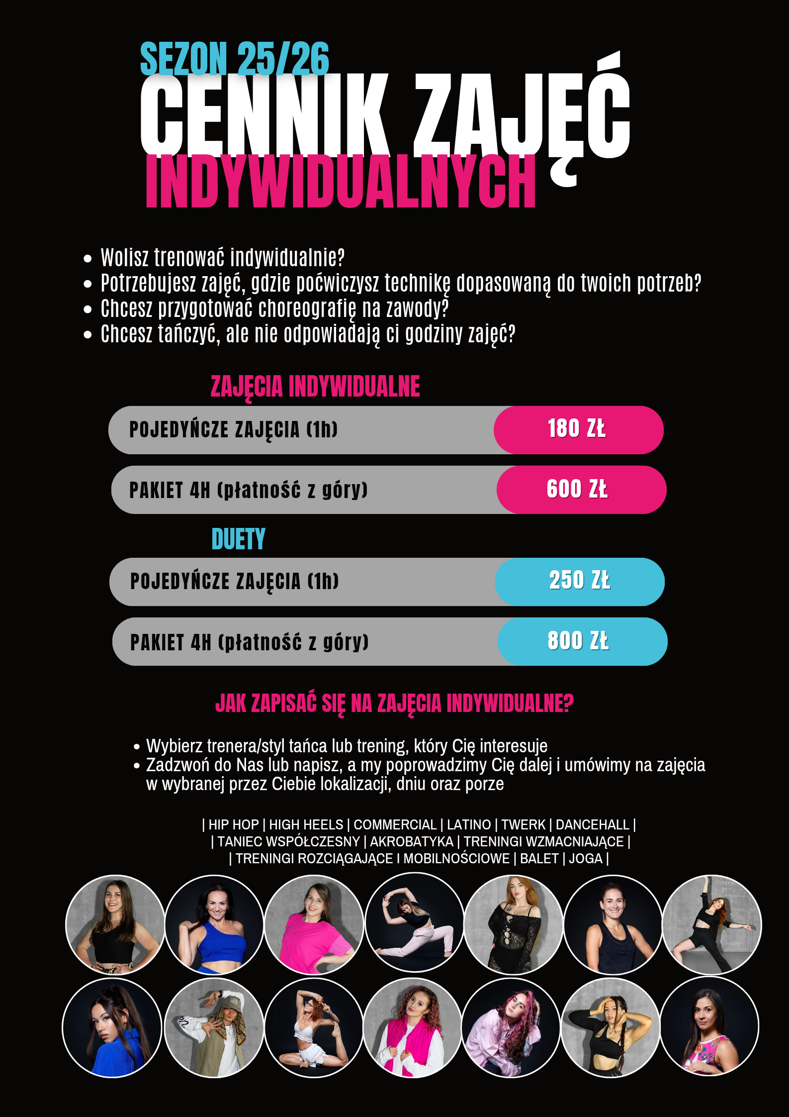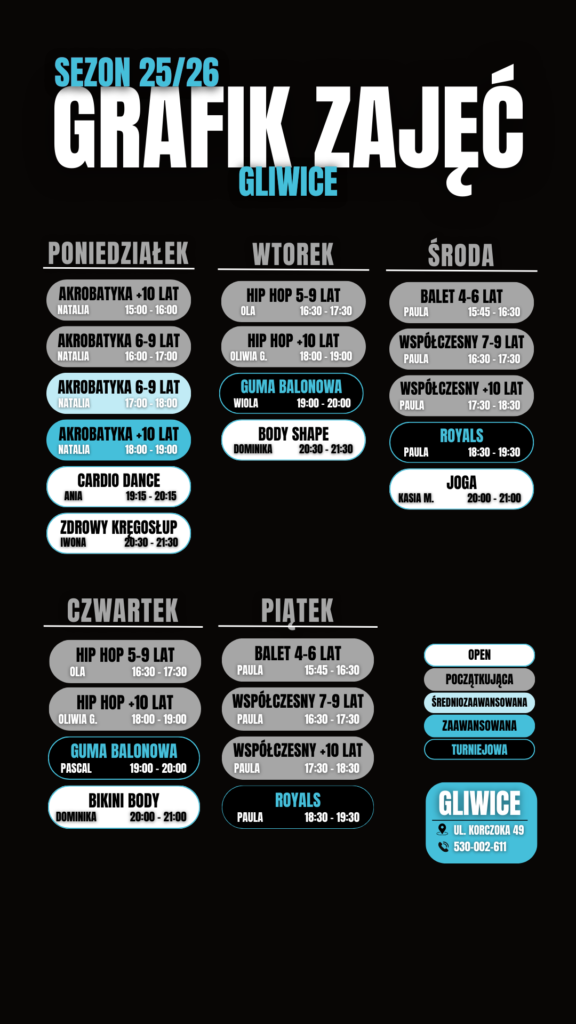Zapraszamy do naszego studia tańca, gdzie każdy, niezależnie od wieku czy doświadczenia, znajdzie coś dla siebie. Proponujemy szeroki wachlarz stylów tanecznych – od hip hopu, przez taniec współczesny, po akrobatykę. Uczymy, inspirujemy i bawimy, zarówno podczas obozów tanecznych dla dzieci, jak i regularnych zajęć dla dorosłych. Odkryj swoją pasję do tańca i dołącz do naszej tanecznej społeczności!